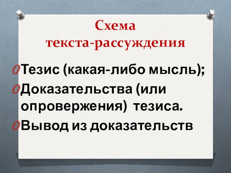 Схема текста-рассужденияТезис (какая-либо мысль);Доказательства (или опровержения) тезиса.Вывод из доказательств