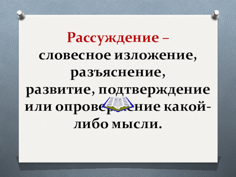 Слайд 3Рассуждение – словесное изложение, разъяснение, развитие, подтверждение или опровержение какой-либо мысли.