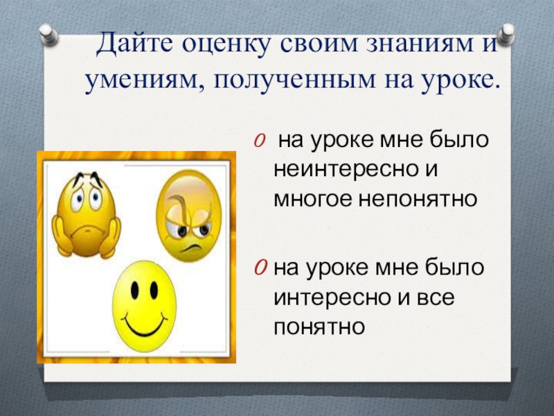 Слайд 15 Дайте оценку своим знаниям и умениям, полученным на уроке.