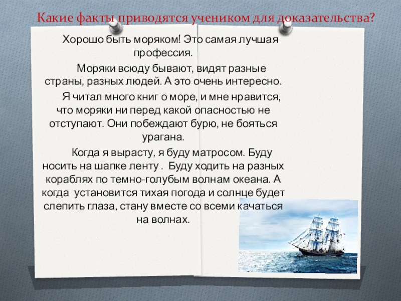 Какие факты приводятся учеником для доказательства?   Хорошо быть моряком! Это самая лучшая профессия.