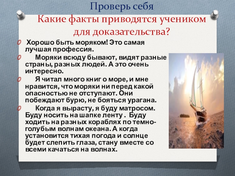 Проверь себя Какие факты приводятся учеником для доказательства? Хорошо быть моряком! Это самая лучшая профессия.
