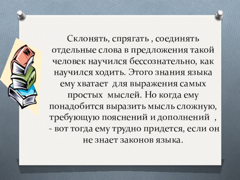 бессознательно, как научился ходить. Этого знания языка ему хватает для выражения самых простых мыслей. Но когда ему понадобится выразить мысль сложную, требующую пояснений и дополнений , - вот тогда ему трудно придется, если он не знает законов языка.