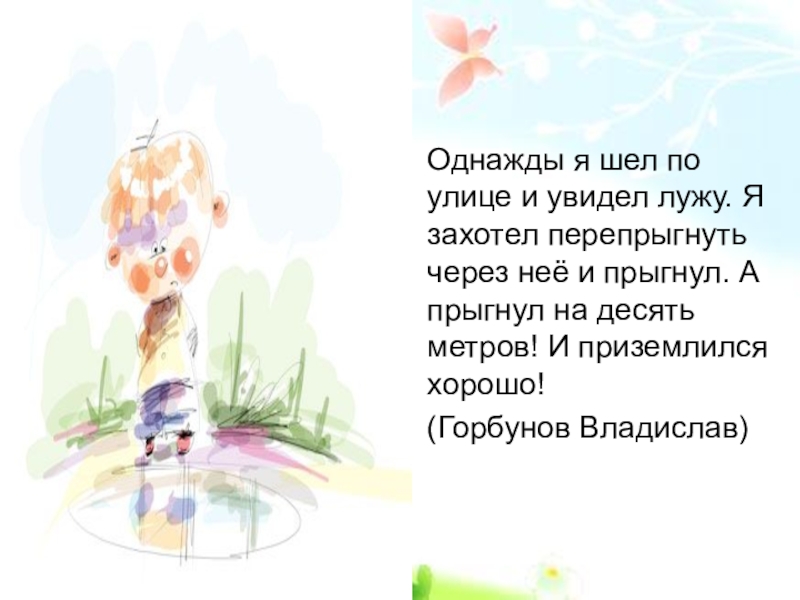 Однажды я шел по улице и увидел лужу. Я захотел перепрыгнуть через неё и прыгнул. А прыгнул