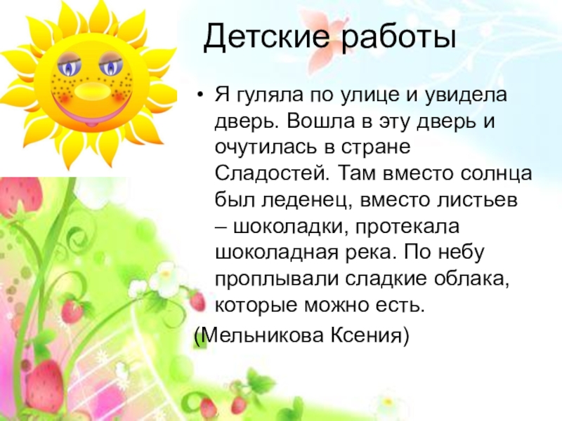 Детские работыЯ гуляла по улице и увидела дверь. Вошла в эту дверь и очутилась в стране Сладостей.