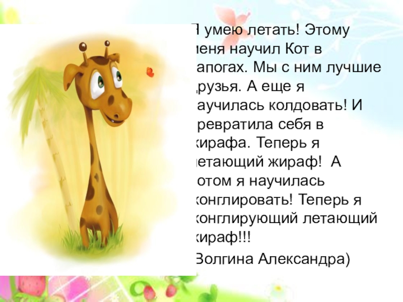 ним лучшие друзья. А еще я научилась колдовать! И превратила себя в жирафа. Теперь я летающий жираф! А потом я научилась жонглировать! Теперь я жонглирующий летающий жираф!!!