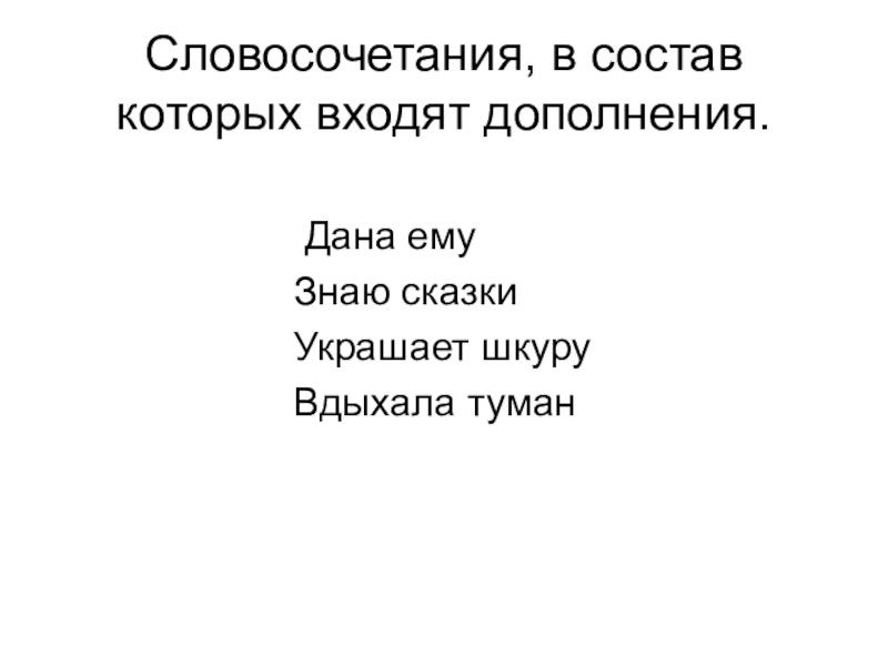 Слайд 10Словосочетания, в состав которых входят дополнения.