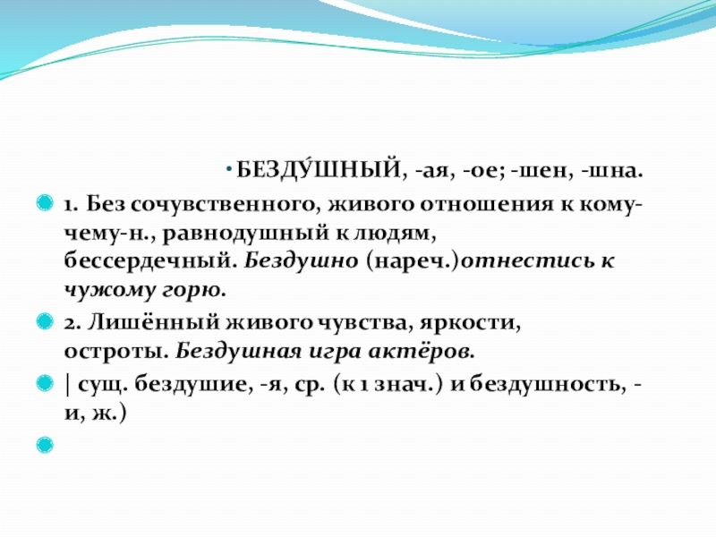 Слайд 7БЕЗДУ́ШНЫЙ, -ая, -ое; -шен, -шна.