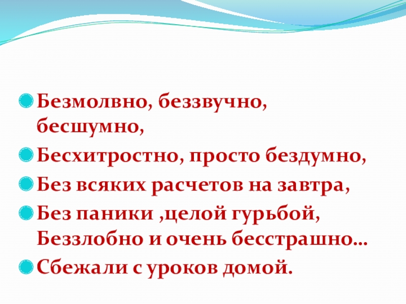 Слайд 18Безмолвно, беззвучно, бесшумно,
