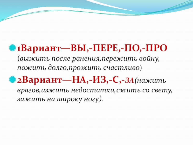 Слайд 161Вариант—ВЫ,-ПЕРЕ,-ПО,-ПРО(выжить после ранения,пережить войну,пожить долго,прожить счастливо)
