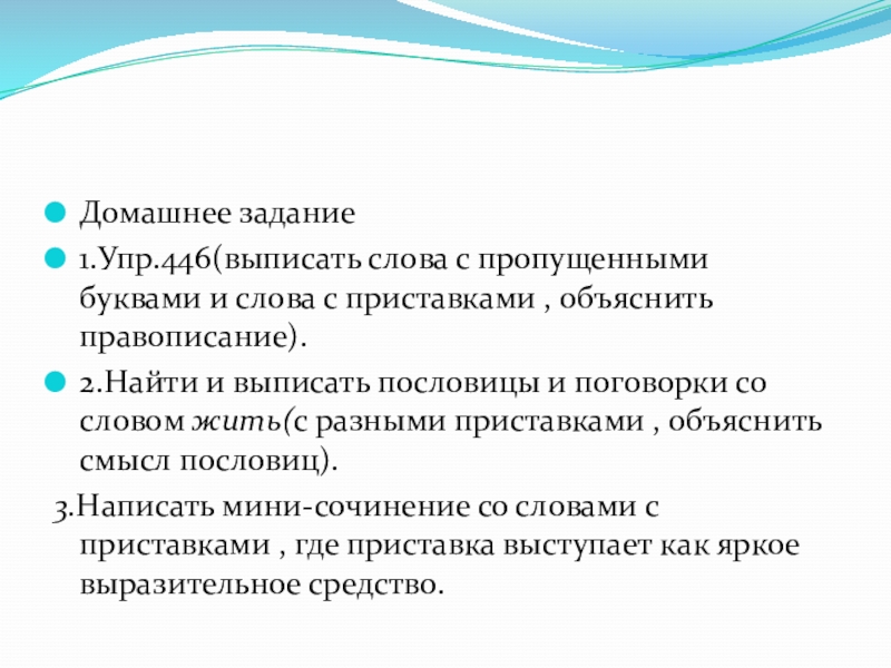1.Упр.446(выписать слова с пропущенными буквами и слова с приставками ,