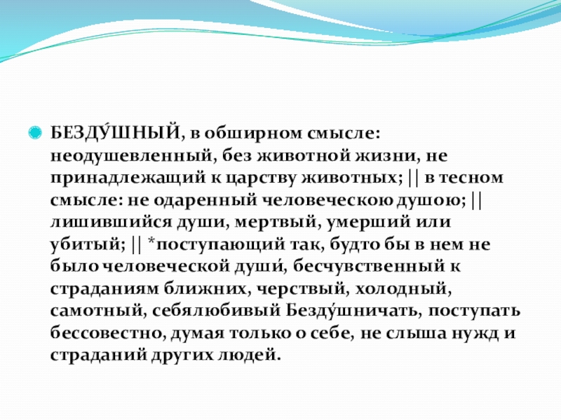 Слайд 6БЕЗДУ́ШНЫЙ, в обширном смысле: неодушевленный, без животной жизни, не принадлежащий к
