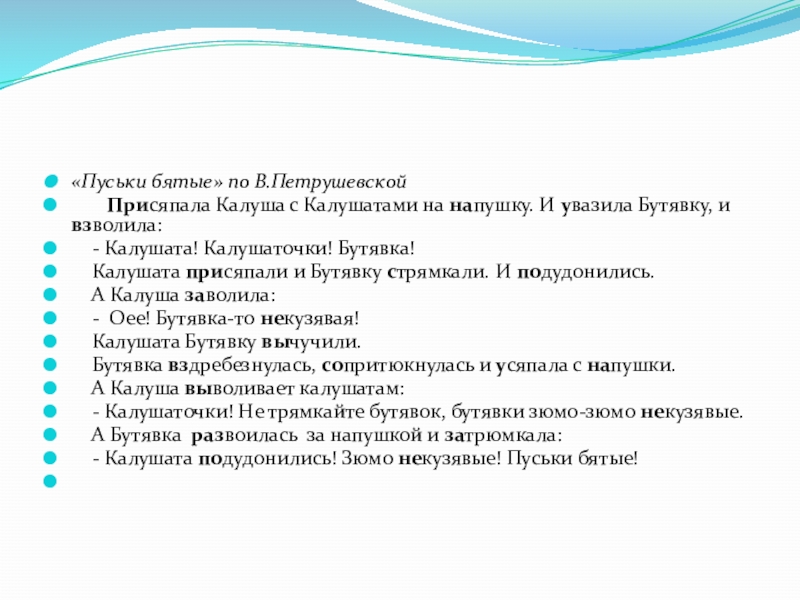 Слайд 13«Пуськи бятые» по В.Петрушевской