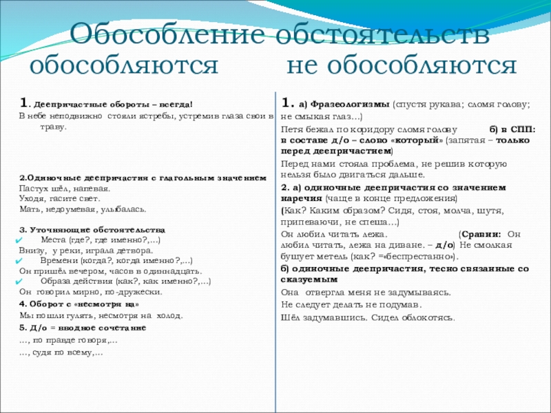 2. а) одиночные деепричастия со значением наречия (чаще в конце предложения)