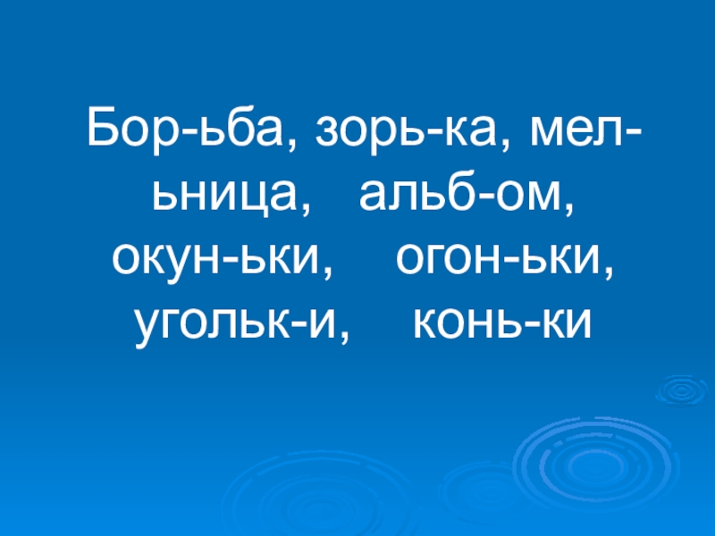 Слайд 2Бор-ьба, зорь-ка, мел-ьница,   альб-ом, окун-ьки,    огон-ьки,угольк-и,    конь-ки