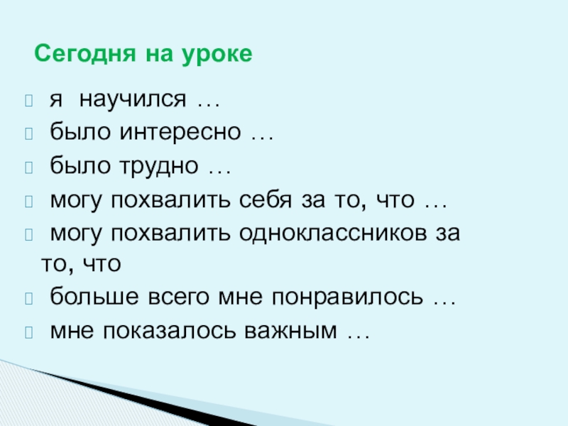 Сегодня на уроке я научился … было интересно … было трудно … могу похвалить себя за то,