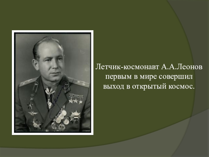 Летчик-космонавт А.А.Леоновпервым в мире совершилвыход в открытый космос.