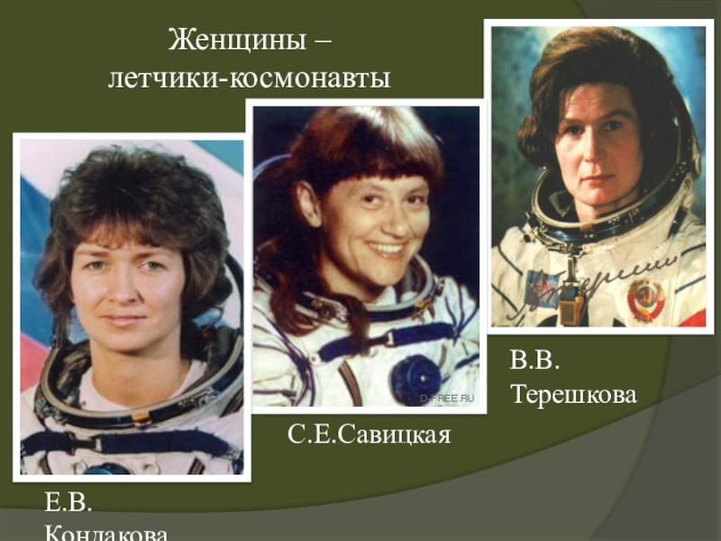 В.В.ТерешковаС.Е.СавицкаяЕ.В.КондаковаЖенщины –летчики-космонавты