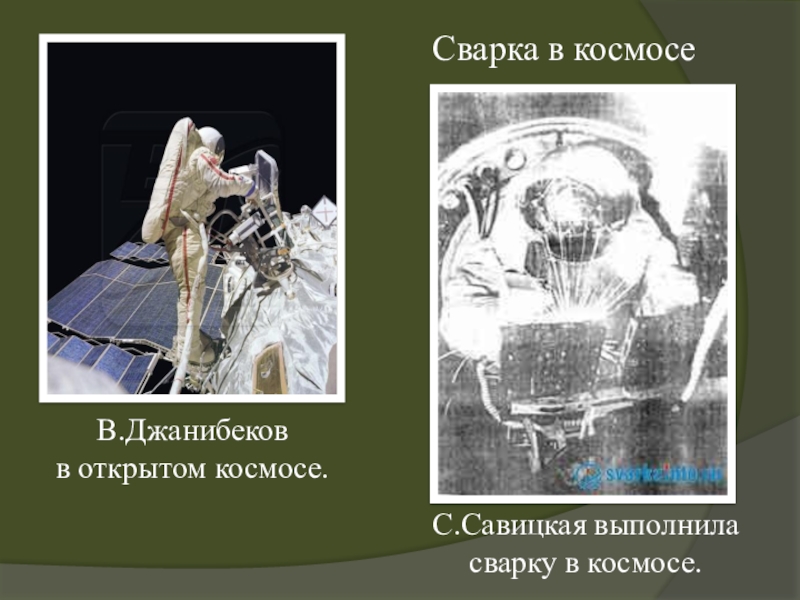 Сварка в космосеВ.Джанибековв открытом космосе.С.Савицкая выполнила сварку в космосе.
