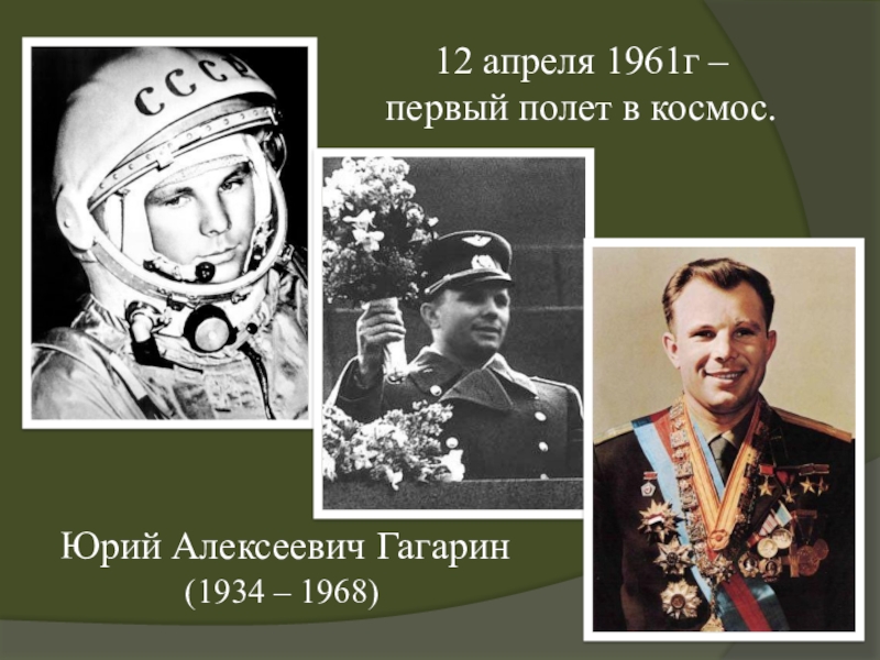 Юрий Алексеевич Гагарин(1934 – 1968)12 апреля 1961г –первый полет в космос.