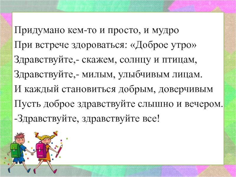 Придумано кем-то и просто, и мудроПри встрече здороваться: «Доброе утро»Здравствуйте,- скажем, солнцу и птицам,Здравствуйте,- милым, улыбчивым лицам.И каждый становиться добрым, доверчивымПусть доброе здравствуйте слышно и вечером.-Здравствуйте, здравствуйте все!