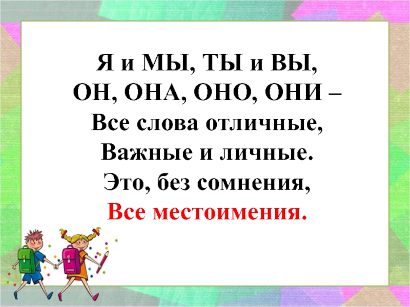 Я и МЫ, ТЫ и ВЫ, ОН, ОНА, ОНО, ОНИ – Все слова отличные,  Важные и