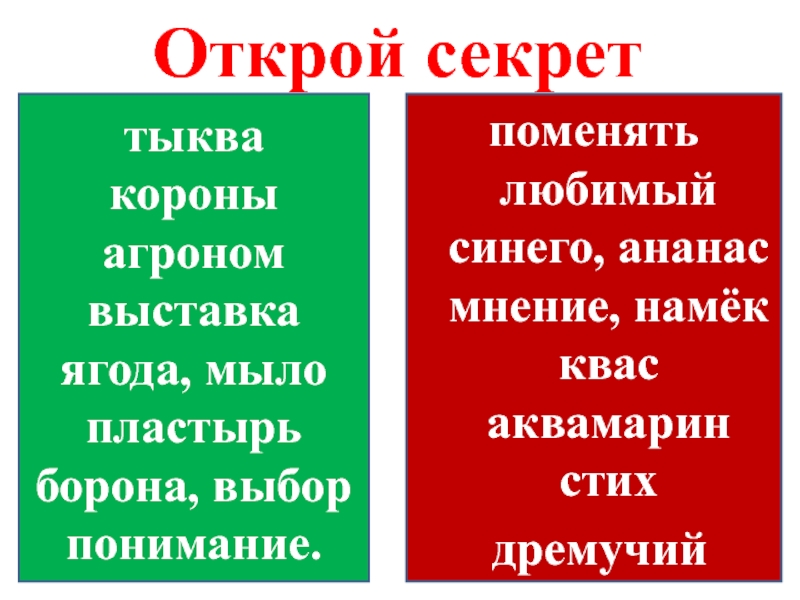 Открой секрет!ТЫква, корОНы агрОНОм ВЫставка Ягода, МЫло пласТЫрьборОНА,ВЫбор пОНИманиепоМЕНЯть любИМый синЕГО, анаНАС МНЕние, НАМёк кВАС акВАМарин стИХ