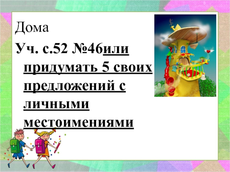 ДомаУч. с.52 №46или придумать 5 своих предложений с личными местоимениями