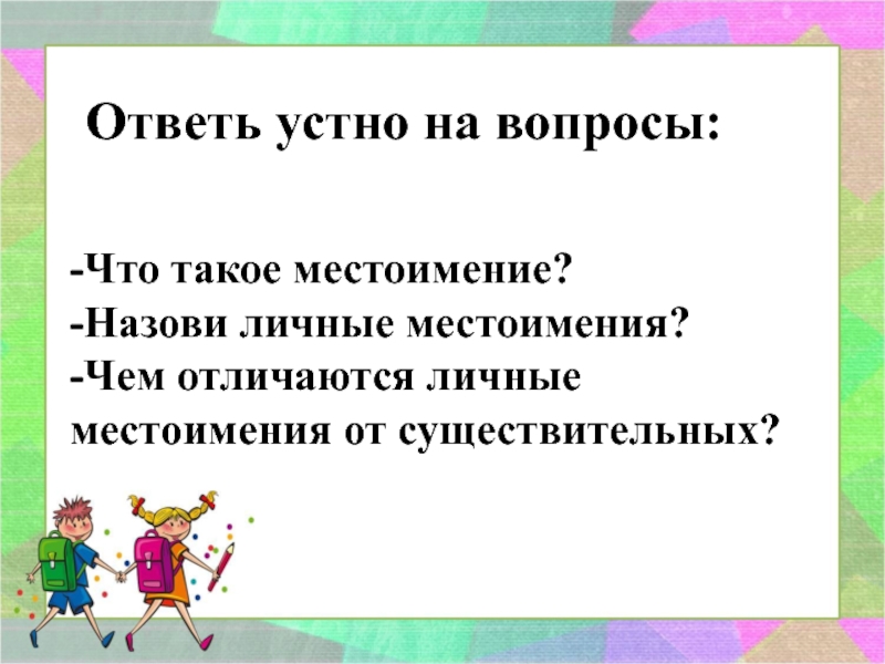 Ответь устно на вопросы:  -Что такое местоимение? -Назови личные местоимения? -Чем отличаются личные местоимения