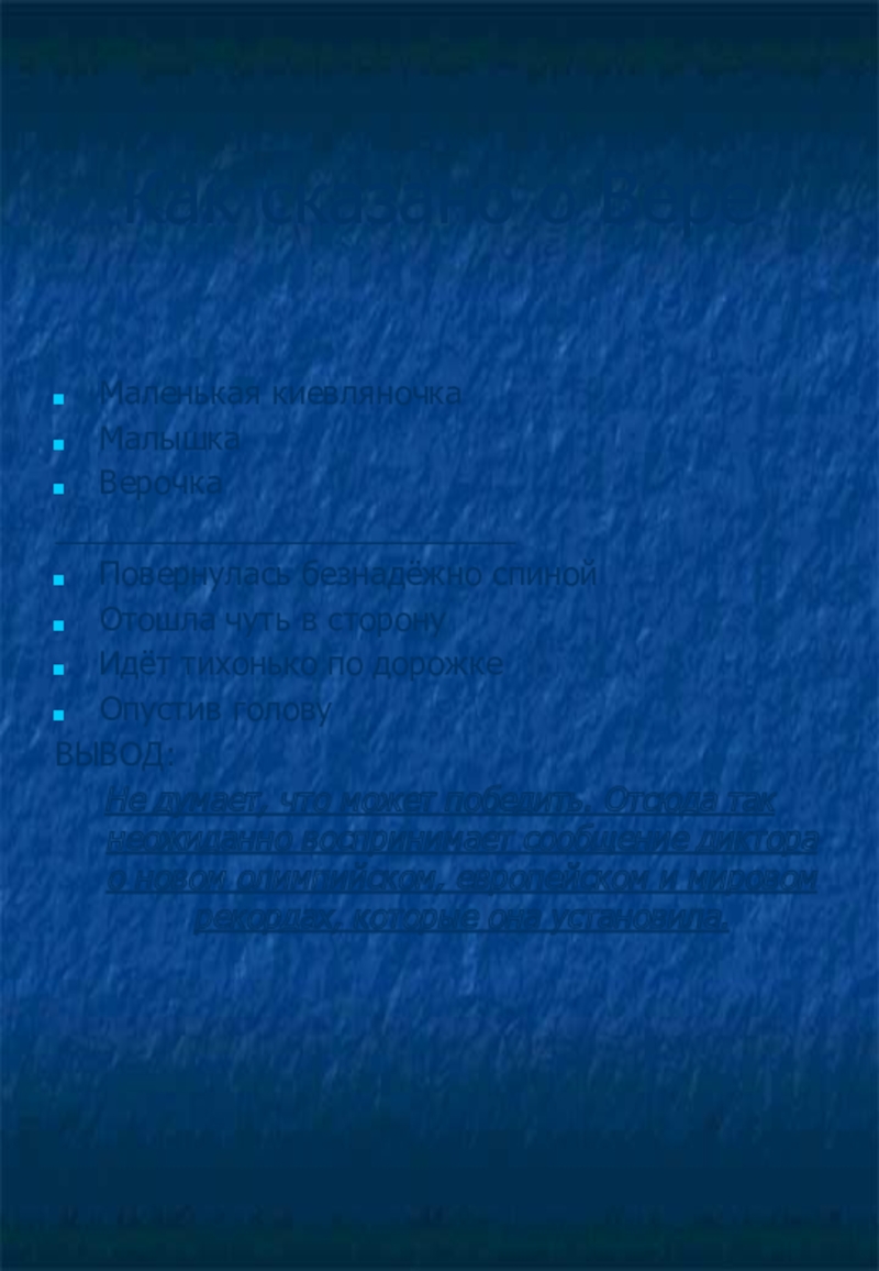Не думает, что может победить. Отсюда так неожиданно воспринимает сообщение диктора о новом олимпийском, европейском и мировом рекордах, которые она установила.