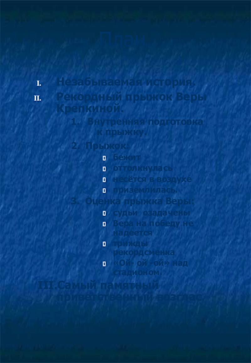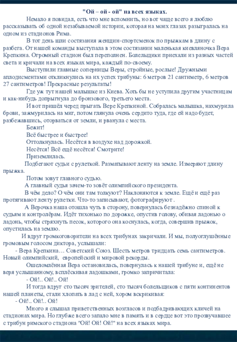 В тот день шли состязания женщин-спортсменок по прыжкам в длину с разбега. От нашей команды выступала в этом состязании маленькая киевляночка Вера Крепкина. Огромный стадион был переполнен. Болельщики приехали из разных частей света и кричали на всех языках мира, каждый по-своему.