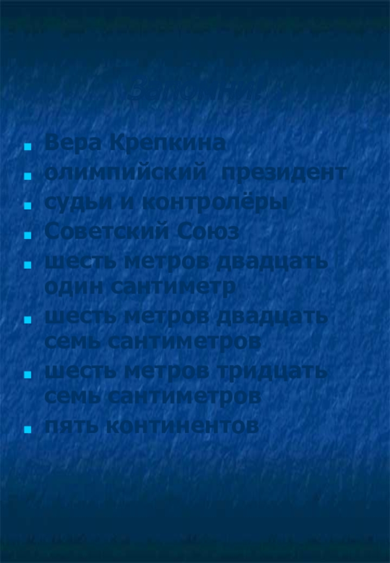 - Вера Крепкина… Советский Союз. Шесть метров тридцать семь сантиметров. Новый олимпийский, европейский и мировой рекорды.