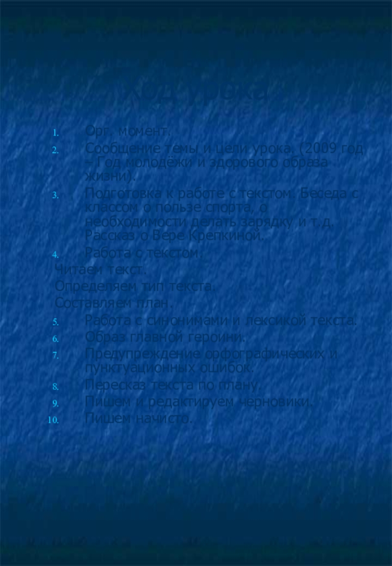Подготовка к работе с текстом. Беседа с классом о пользе спорта, о необходимости делать зарядку и т.д. Рассказ о Вере Крепкиной.