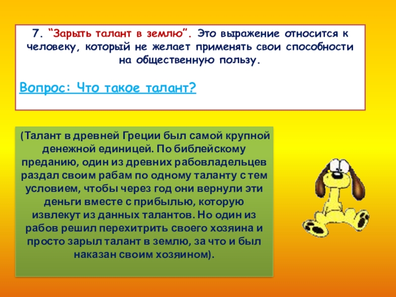 (Талант в древней Греции был самой крупной денежной единицей. По библейскому преданию, один из древних рабовладельцев раздал своим рабам по одному таланту с тем условием, чтобы через год они вернули эти деньги вместе с прибылью, которую извлекут из данных талантов. Но один из рабов решил перехитрить своего хозяина и просто зарыл талант в землю, за что и был наказан своим хозяином).