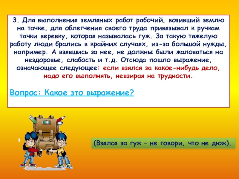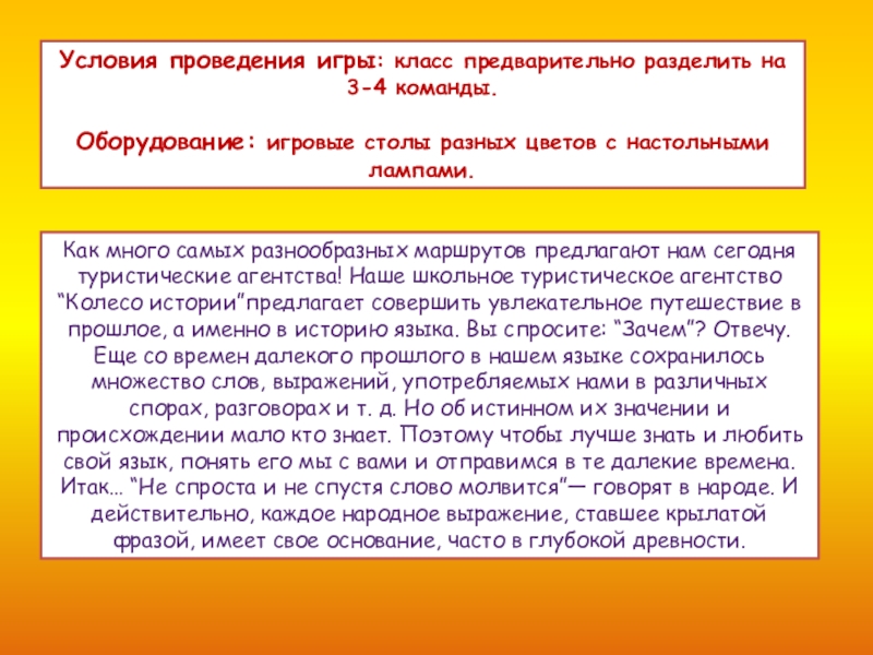 Как много самых разнообразных маршрутов предлагают нам сегодня туристические агентства! Наше школьное туристическое агентство “Колесо истории”предлагает совершить увлекательное путешествие в прошлое, а именно в историю языка. Вы спросите: “Зачем”? Отвечу. Еще со времен далекого прошлого в нашем языке сохранилось множество слов, выражений, употребляемых нами в различных спорах, разговорах и т. д. Но об истинном их значении и происхождении мало кто знает. Поэтому чтобы лучше знать и любить свой язык, понять его мы с вами и отправимся в те далекие времена. Итак… “Не спроста и не спустя слово молвится”— говорят в народе. И действительно, каждое народное выражение, ставшее крылатой фразой, имеет свое основание, часто в глубокой древности.