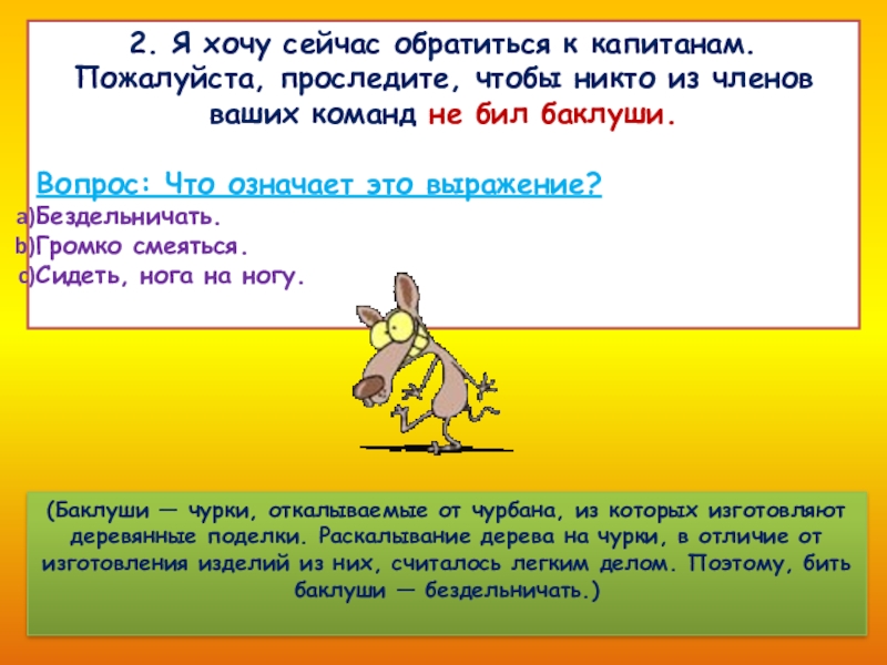 (Баклуши — чурки, откалываемые от чурбана, из которых изготовляют деревянные поделки. Раскалывание дерева на чурки, в отличие от изготовления изделий из них, считалось легким делом. Поэтому, бить баклуши — бездельничать.)