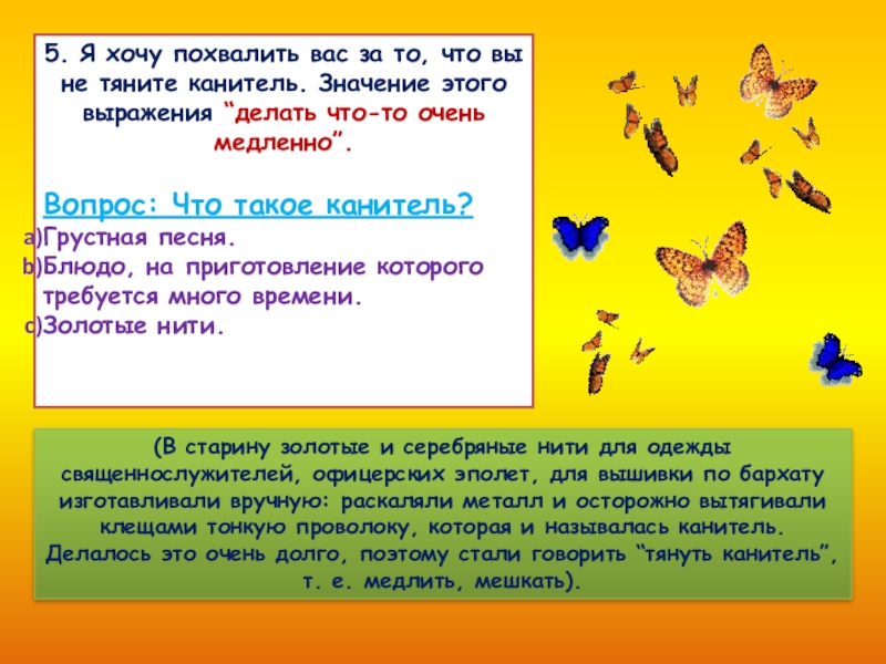 (В старину золотые и серебряные нити для одежды священнослужителей, офицерских эполет, для вышивки по бархату изготавливали вручную: раскаляли металл и осторожно вытягивали клещами тонкую проволоку, которая и называлась канитель. Делалось это очень долго, поэтому стали говорить “тянуть канитель”, т. е. медлить, мешкать).