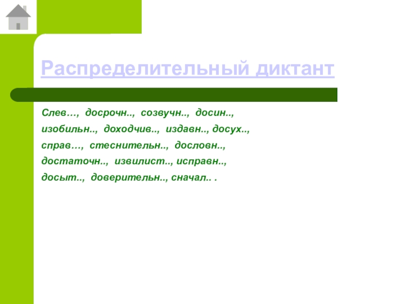 Распределительный диктантСлев…, досрочн.., созвучн.., досин.., изобильн.., доходчив.., издавн.., досух..,справ…, стеснительн.., дословн.., достаточн.., извилист.., исправн.., досыт.., доверительн.., сначал..