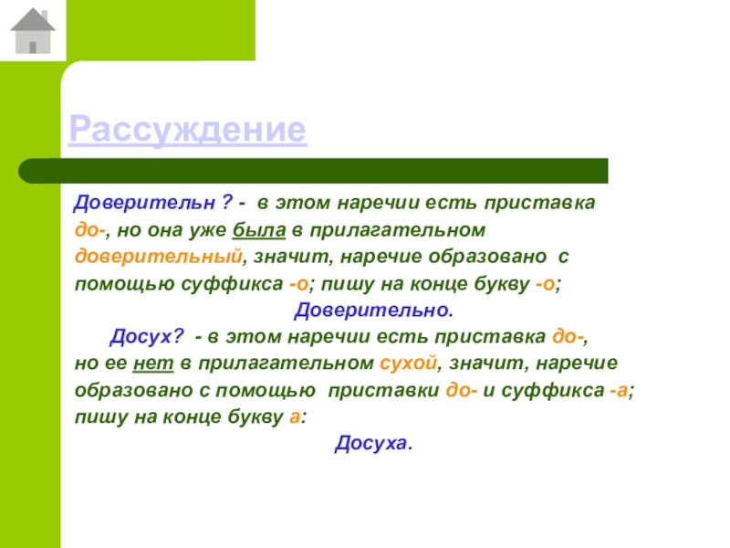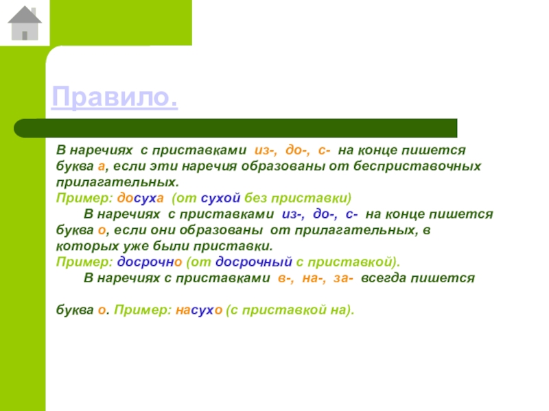Пример: досуха (от сухой без приставки)