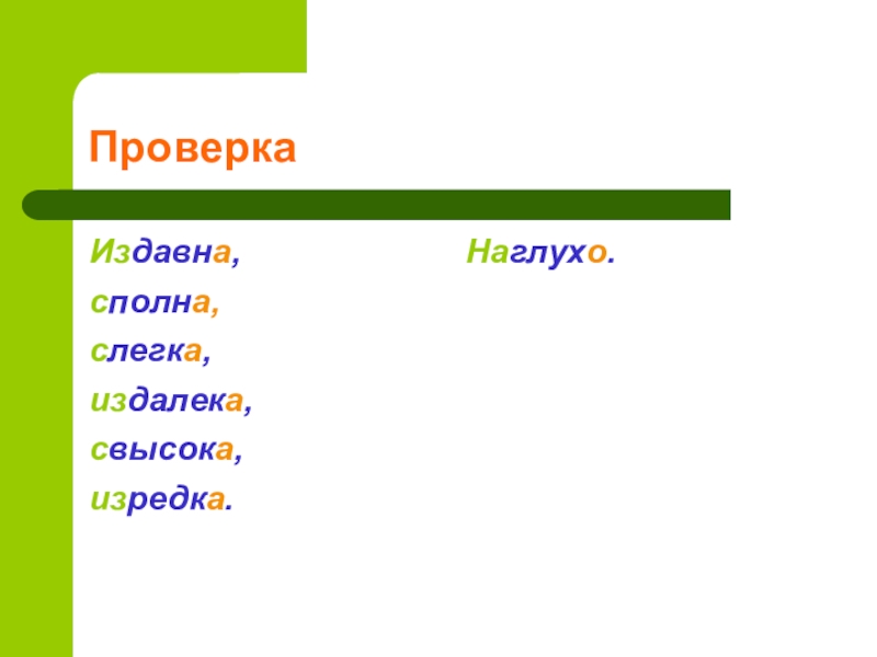 ПроверкаИздавна, сполна, слегка, издалека, свысока, изредка.Наглухо.