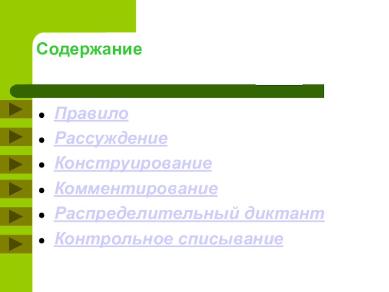 Содержание ПравилоРассуждениеКонструированиеКомментированиеРаспределительный диктантКонтрольное списывание