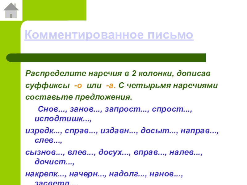 Комментированное письмоРаспределите наречия в 2 колонки, дописав суффиксы -о или -а. С четырьмя наречиями составьте предложения.	Снов..., занов...,