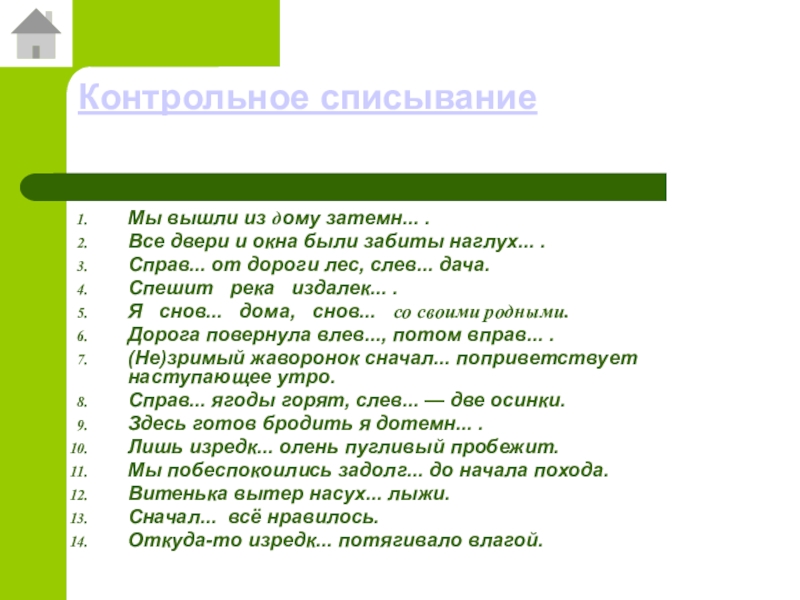 Контрольное списываниеМы вышли из дому затемн... .Все двери и окна были забиты наглух... . Справ... от дороги
