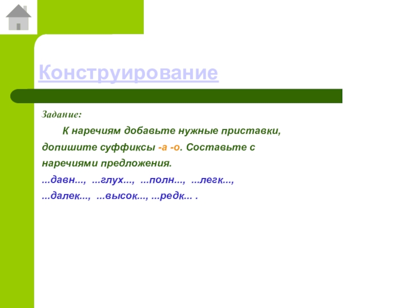КонструированиеЗадание: 	К наречиям добавьте нужные приставки, допишите суффиксы -а -о. Составьте с наречиями предложения....давн..., ...глух..., ...полн..., ...легк...,