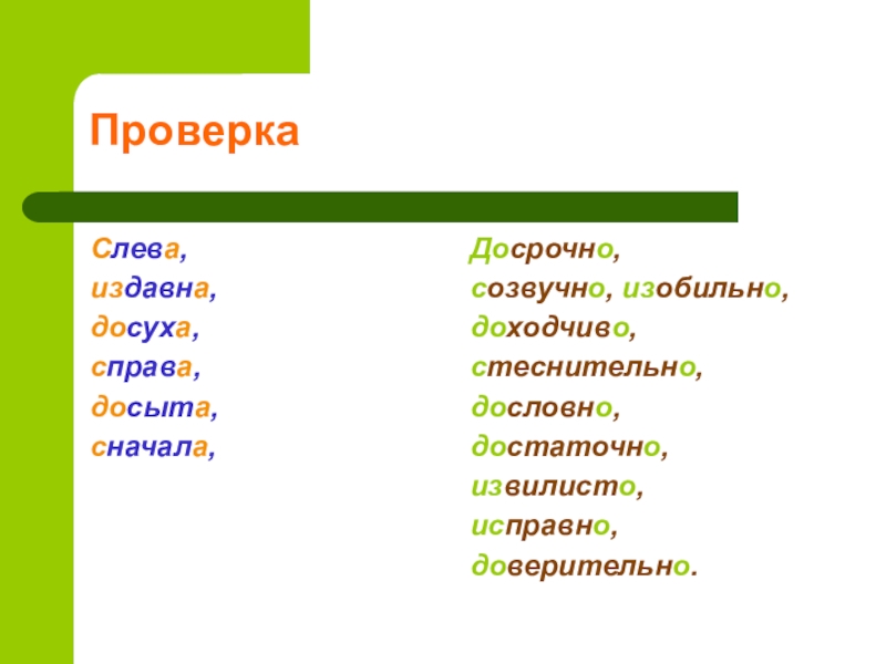 Проверка Слева, издавна, досуха, справа, досыта, сначала,Досрочно, созвучно, изобильно,доходчиво,стеснительно, дословно, достаточно, извилисто, исправно, доверительно.
