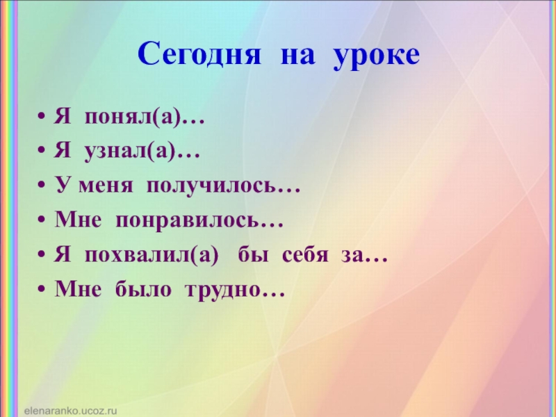 Сегодня на урокеЯ понял(а)…Я узнал(а)…У меня получилось…Мне понравилось…Я похвалил(а)  бы себя за…Мне было трудно…