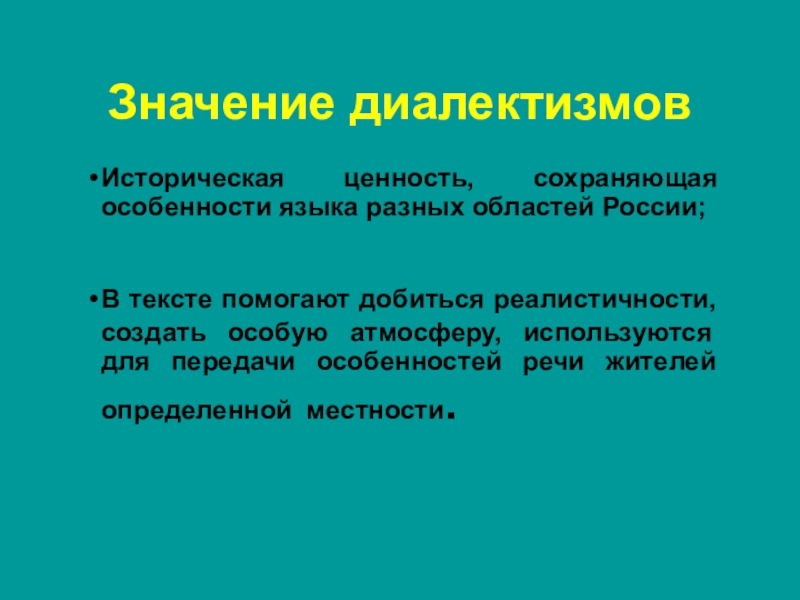 добиться реалистичности, создать особую атмосферу, используются для передачи особенностей речи жителей определенной местности.