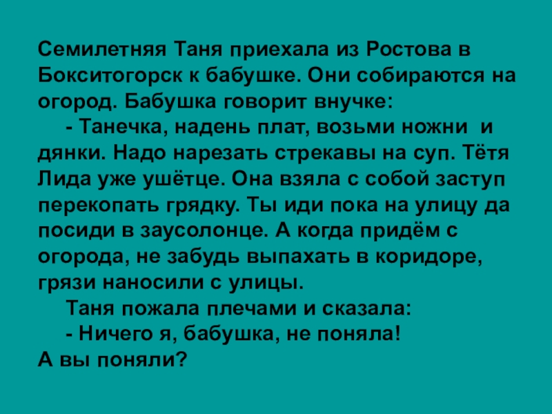 Слайд 2Семилетняя Таня приехала из Ростова в Бокситогорск к бабушке. Они собираются