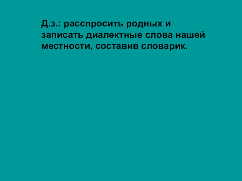 Слайд 18Д.з.: расспросить родных и записать диалектные слова нашей местности, составив словарик.