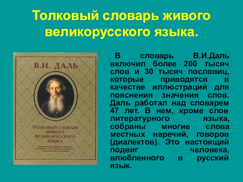 слов и 30 тысяч пословиц, которые приводятся в качестве иллюстраций для пояснения значения слов. Даль работал над словарем 47 лет. В нем, кроме слов литературного языка, собраны многие слова местных наречий, говоров (диалектов). Это настоящий подвиг человека, влюбленного в русский язык.