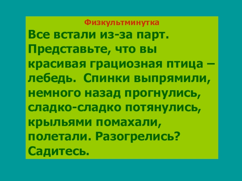 лебедь. Спинки выпрямили, немного назад прогнулись, сладко-сладко потянулись, крыльями помахали, полетали. Разогрелись? Садитесь.